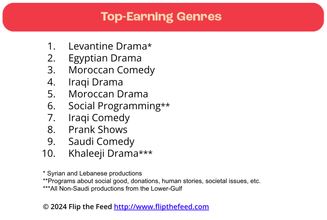 What this means: These are the genres that made the most money for broadcasters on social. The graph shows all videos that were monetized on social (showing ad breaks). Egyptian drama was at a disadvantage because of limited ads from/in the Egyptian market. 2023 was an exception, we might see this change in 2024.