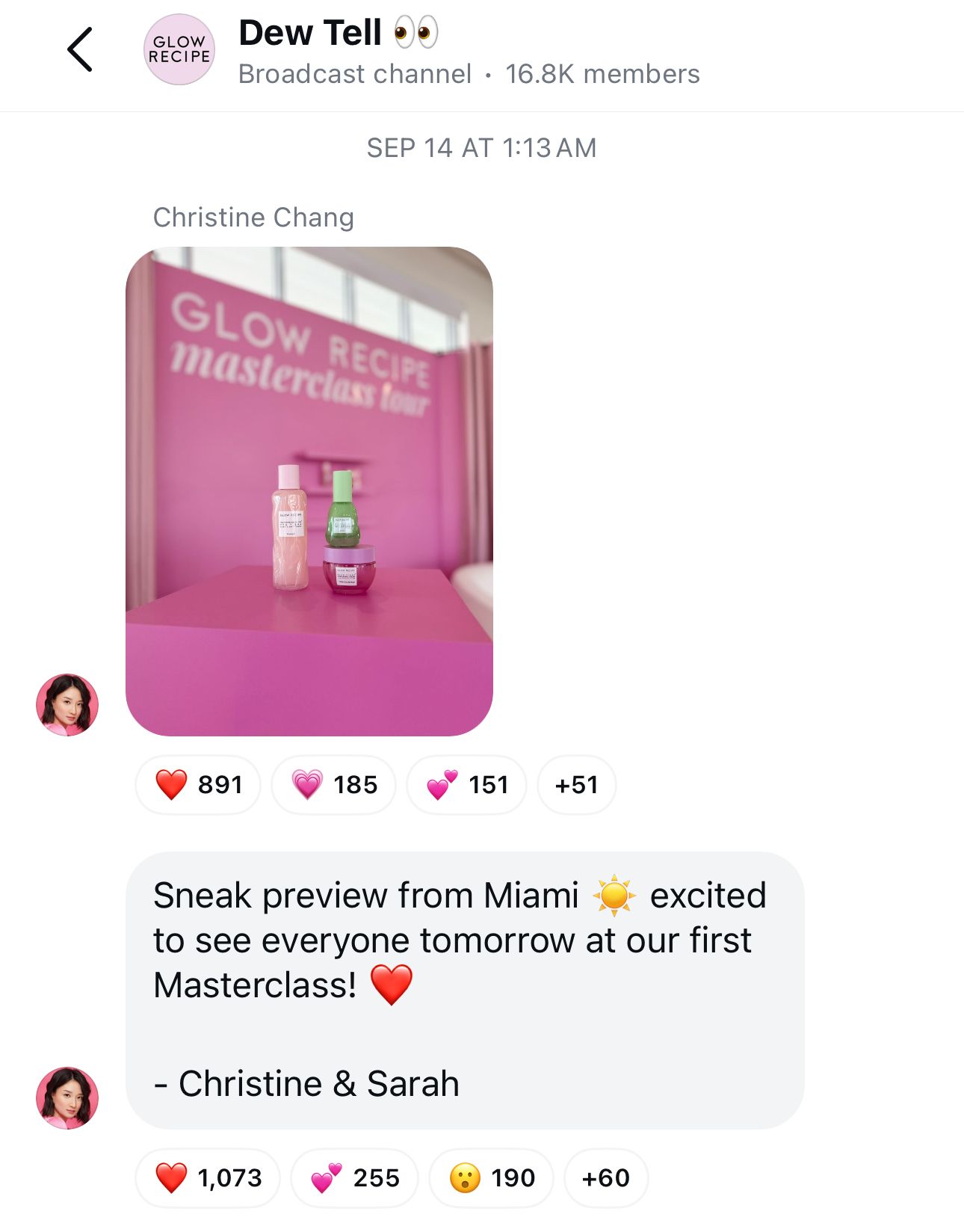 Glow Recipe, the skincare company, has a broadcast channel called “Dew Tell” where their co-founders often chime in and provide updates and BTS footage. It’s fun that the co-founder posts come from their accounts versus the brand account. They have 16.8K members.
