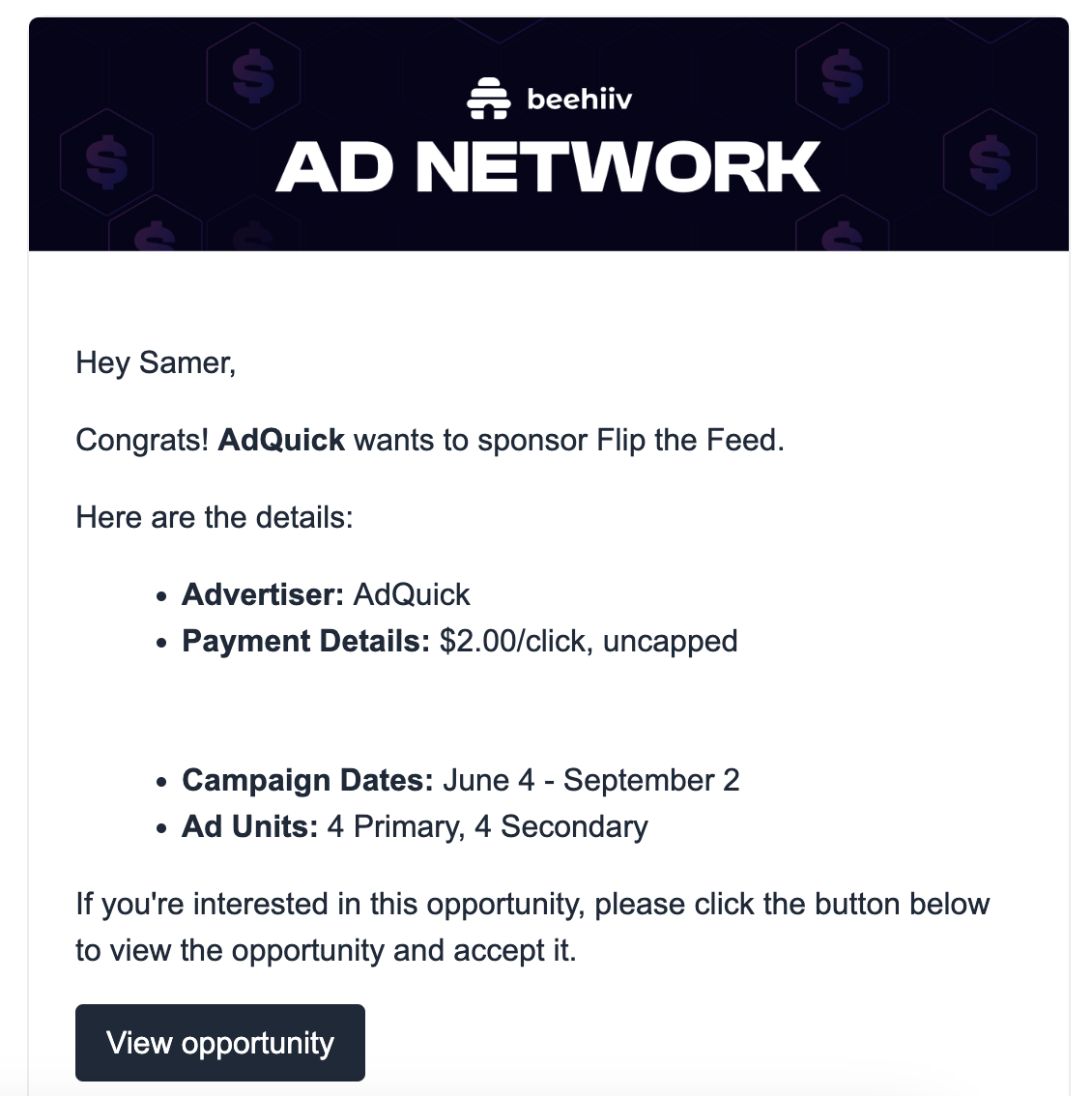 beehiiv’s ad network matches advertisers with the content of my newsletter and sends me sponsorship opportunities multiple times a week.