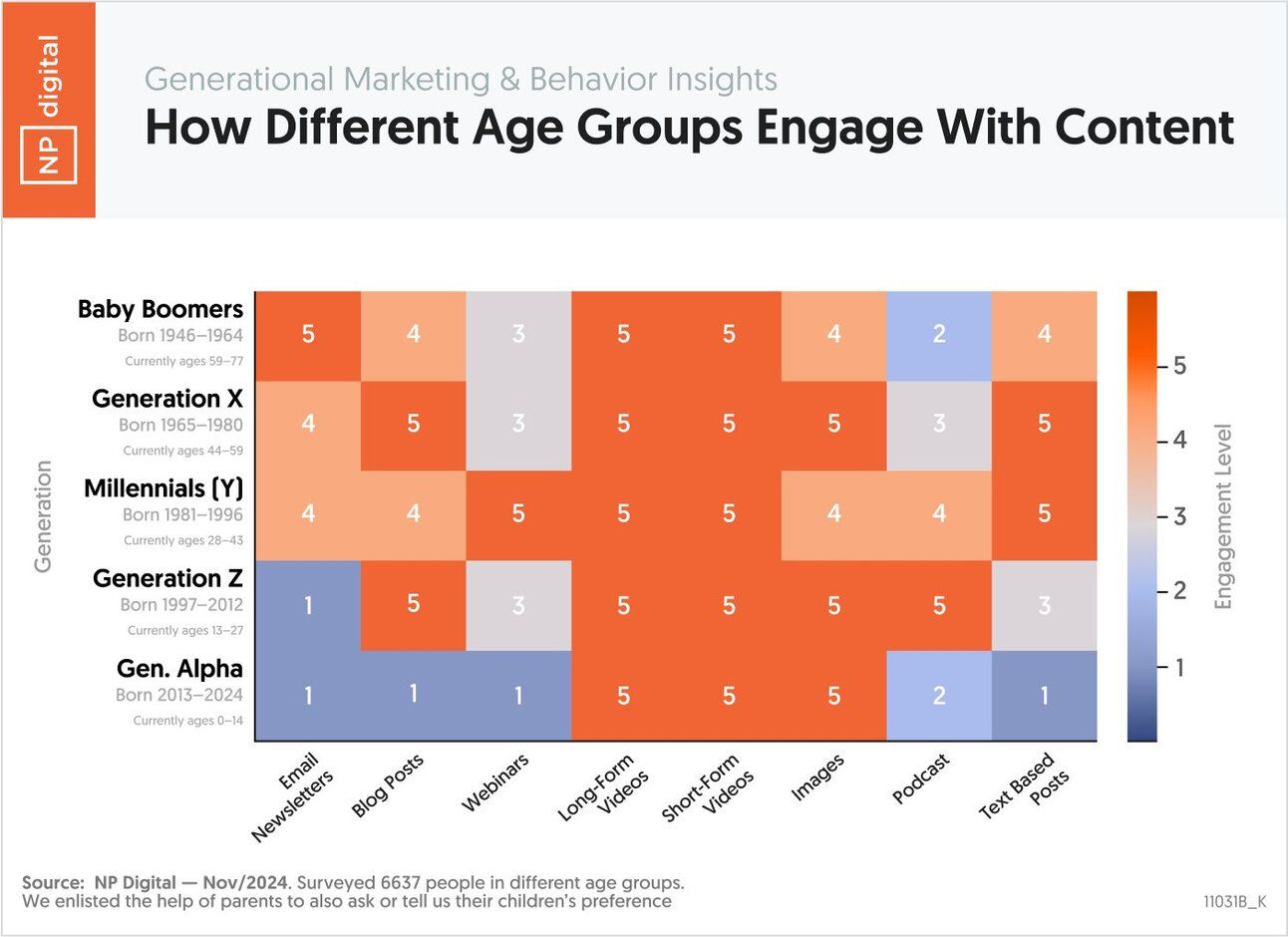 Here's something that might surprise you: Baby Boomers and Gen X are still very much engaged with email newsletters (scoring 5/5 and 4/5 respectively).